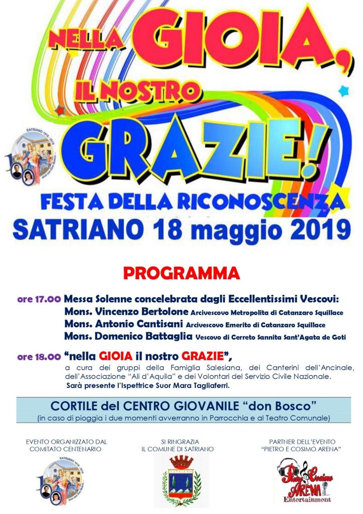 In data 18 maggio 2019, nell’ambito dei festeggiamenti per il centenario di presenza salesiana, si terrà a Satriano la festa della RICONOSCENZA, dal tema “Nella GIOIA in nostro GRAZIE”.
