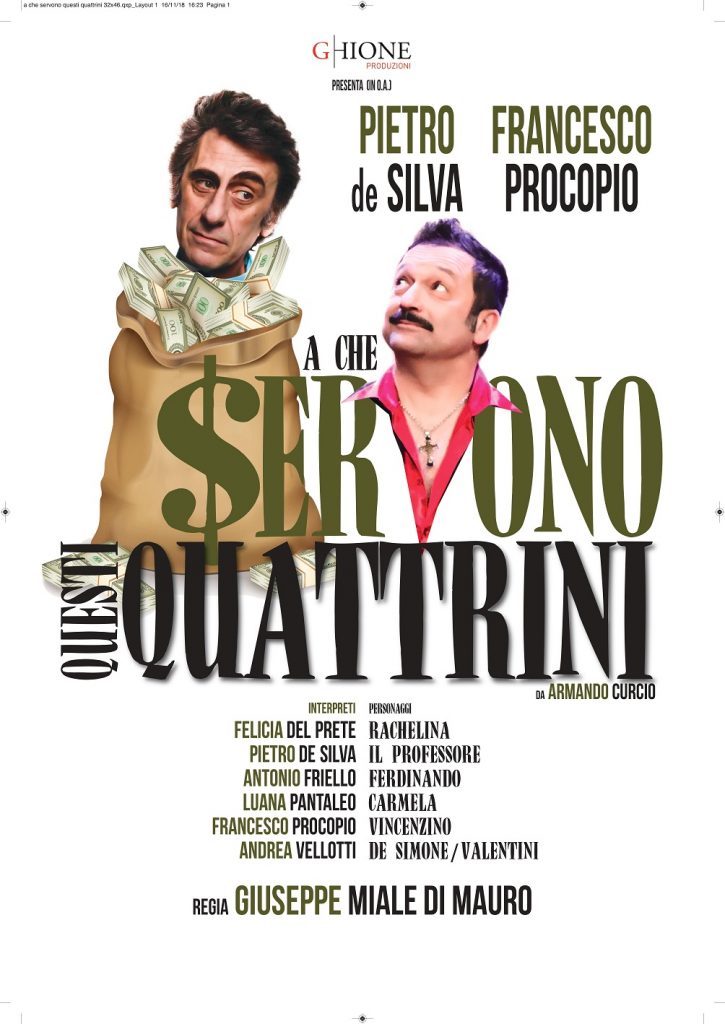 Pietro De Silva, Francesco Propocio insieme con Maria Chiara Centorami, Stefano Meglio, Luana Pantaleo e Andrea Vellotti saranno gli interpreti del prossimo spettacolo al Teatro del Grillo di Soverato “A che servono questi quattrini” di Armando Curcio per la regia di Giuseppe Miale di Mauro. L’appuntamento è per domenica 3 marzo alle ore 17 e 20.45.