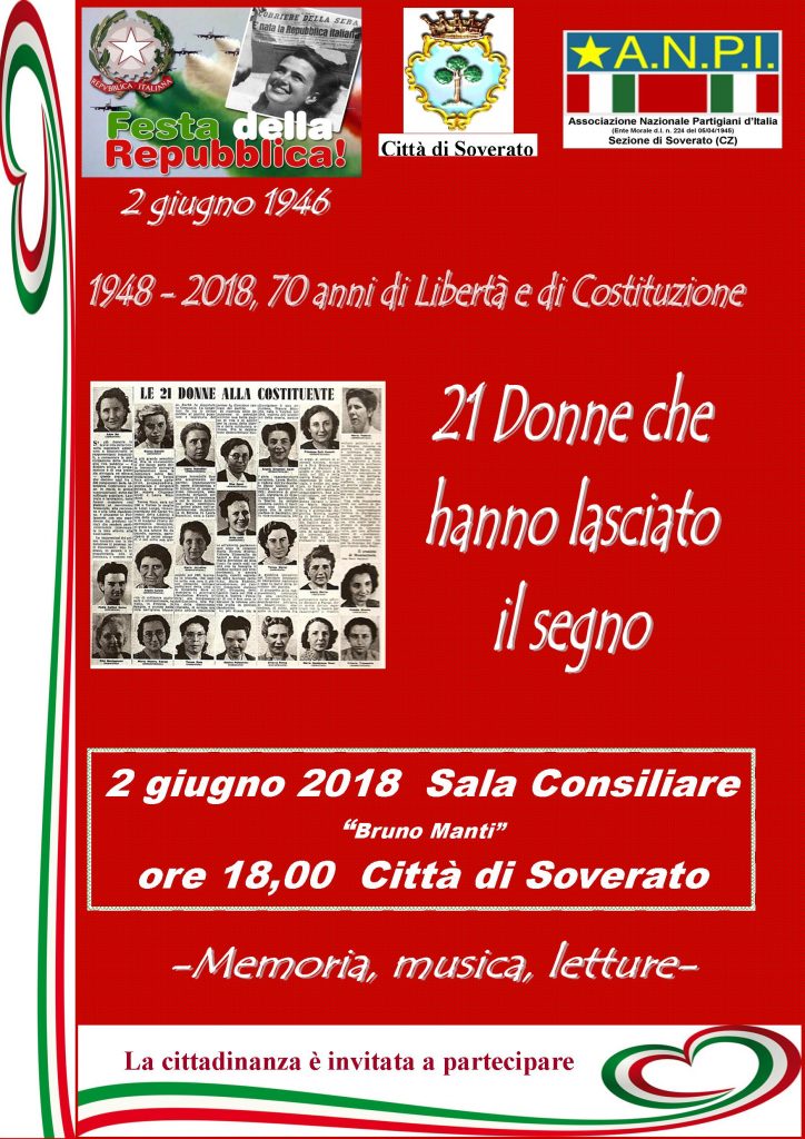 Su tanti articoli della nostra Costituzione, determinante fu il contributo delle 21 Donne della Costituente. Il 2 giugno prossimo, alle ore 18,00 nella sala consiliare della Città di Soverato, in collaborazione con l’Amministrazione comunale dedicheremo la Festa della Repubblica proprio alle 21 Donne della Costituente, ripercorrendo le loro storie e il loro impegno per rendere l’Italia un paese migliore.