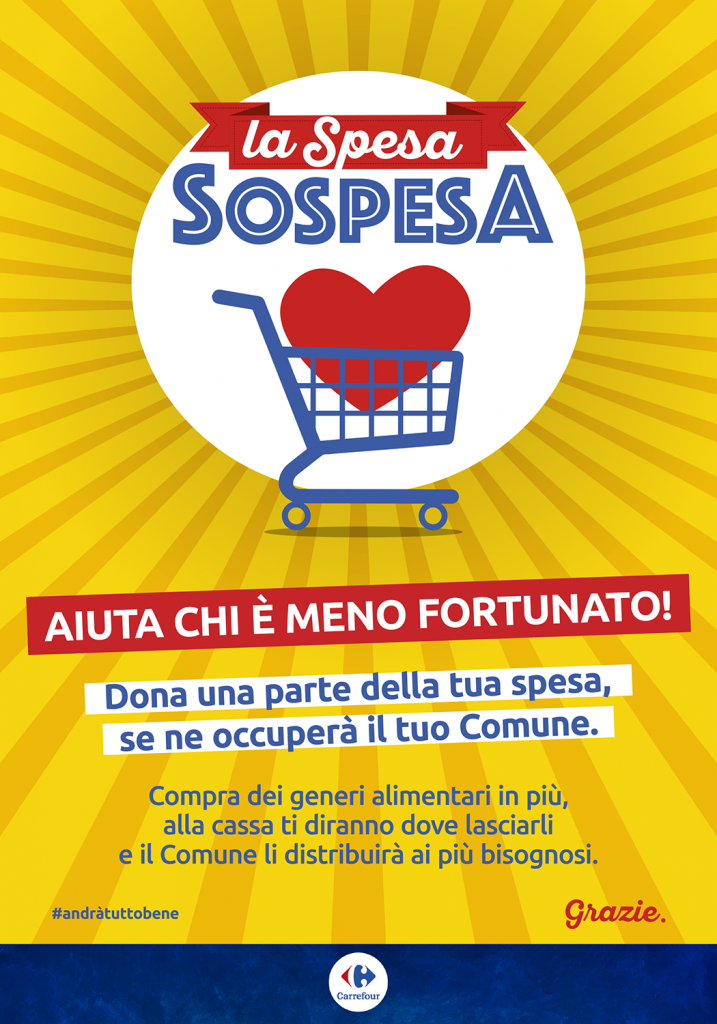 Si parte da “La Spesa Sospesa”, ispirata alla tradizione solidale del caffè sospeso napoletano, che consente agli utenti dei supermercati di acquistare qualche articolo in più durante la loro spesa (generi alimentari di prima necessità, prodotti per l’infanzia o per l’igiene personale e femminile) e di lasciarli in un carrello dedicato, posizionato subito dopo le casse per consentire ai Comuni di riferimento di distribuirli a chi ne ha bisogno in collaborazione con la Protezione Civile.