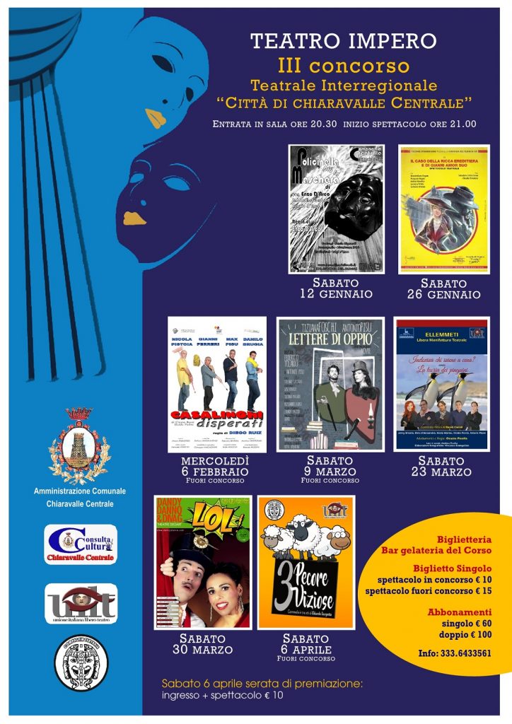 La rassegna, giunta alla sua terza edizione, è promossa e organizzata dall’amministrazione comunale di Chiaravalle Centrale, con la collaborazione della Consulta della Cultura, dell’Unione italiana libero teatro e della compagnia de “I Commedianti”, con la direzione artistica di Gino Capolupo.