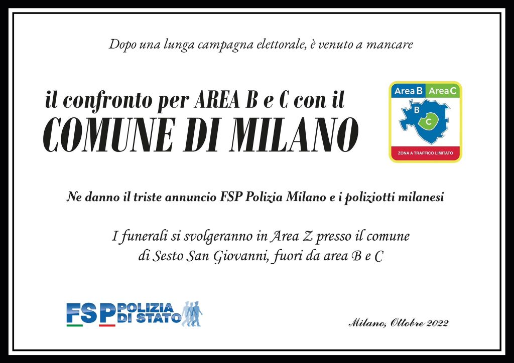 Area B e C a Milano, Fsp Polizia: “Incredibile che ci venga impedito di fare sicurezza. Specificità del nostro lavoro sconosciuta al Comune”. E dal 17 via ai manifesti “funebri”