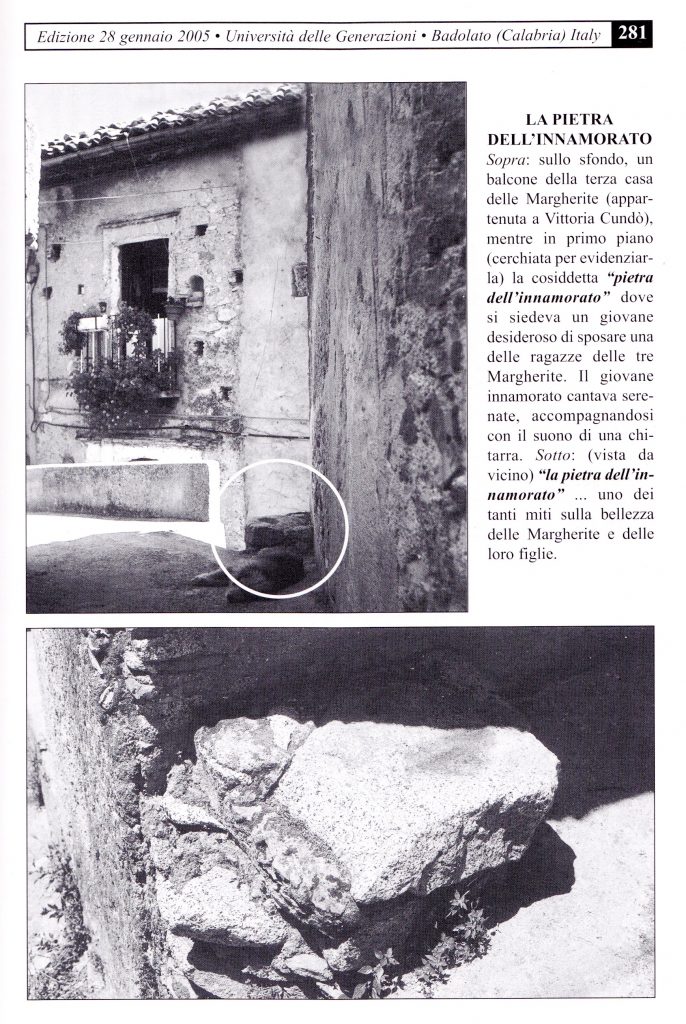 Ovviamente, le figlie delle tre Margherite ebbero tanti corteggiatori. Uno di questi innamorati, per stare più comodamente seduto nel cantare più a lungo le sue serenate dedicate alla sua giovane Margherita, mise una grossa pietra all’angolo tra Via Piliero e Via Siena. Da questa posizione poteva vedere benissimo il balcone dell’amata e, quindi, cantare con più passione le sue suggestive canzoni d’amore. Da allora in poi, quella fu indicata come “la pietra dell’innamorato”. Una pietra porta-fortuna. I due si sposarono ed ebbero, a loro volta, pure delle belle figlie, cosicché la tradizione delle serenate continuò per altri innamorati finché l’emigrazione non spazzò completamente tale bella tradizione, svuotando la ruga delle Margherite così come quasi tutto il borgo. Borgo che, poi, uno dei tanti nipoti delle Margherite, nel 1986 mise provocatoriamente in vendita con la speranza di salvarlo dalla morte per spopolamento.