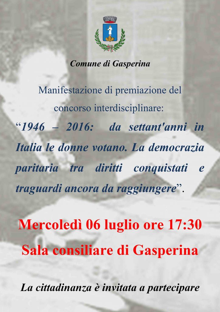 Mercoledì 6 luglio alle ore 17:30 presso la sala consiliare del comune di Gasperina ci sarà la manifestazione di premiazione del concorso interdisciplinare: <<1946 – 2016: da settant’anni in Italia le donne votano. La democrazia paritaria tra diritti conquistati e traguardi ancora da raggiungere>> La giuria, composta dalle docenti Marisa Fagà, Patrizia Fulciniti, Giuseppina Nisticò, Maria Pasqua e Vincenzina Perciavalle, dopo un’attenta analisi dei nove elaborati presentati, decreterà i primi tre classificati.