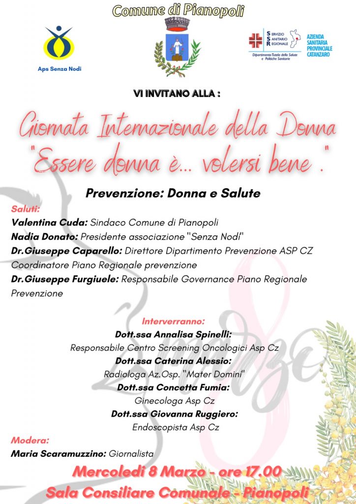 Giornata internazionale della donna, “Essere donna è volersi bene. Prevenzione: donna e salute”, Mercoledì 8 marzo 2023 ore 17 – sala consiliare del Comune di Pianopoli.