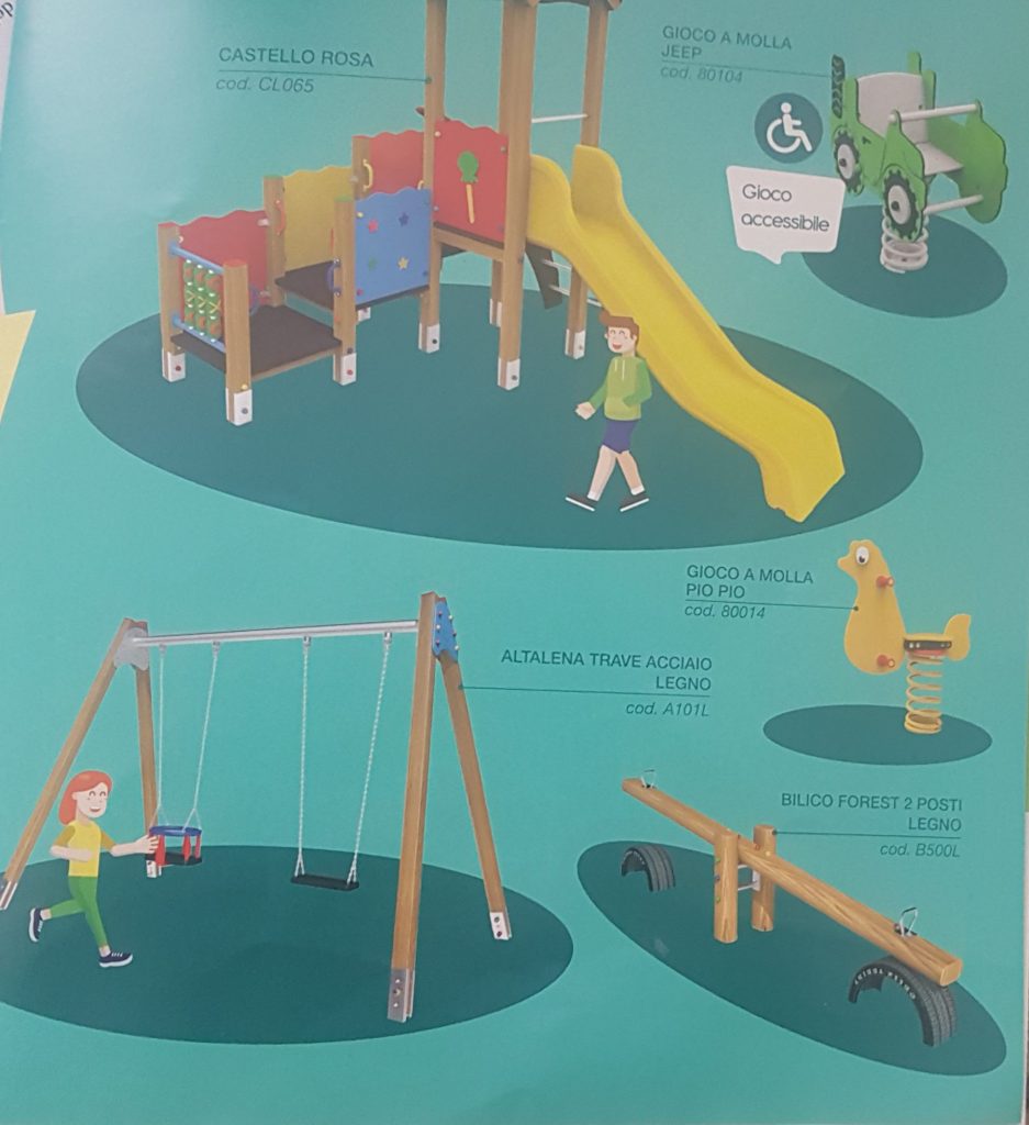 Sarà installata una nuova e più sicura superficie anti trauma (tappetino); ci sarà un arco completo in legno costituto da una giostra Eddy piccola, un castello rosa, un gioco a molla inclusivo a figura doppia, un gioco a molla singolo pio pio, un bilico Forest 2 posti in legno, un’altalena trave acciaio legno.