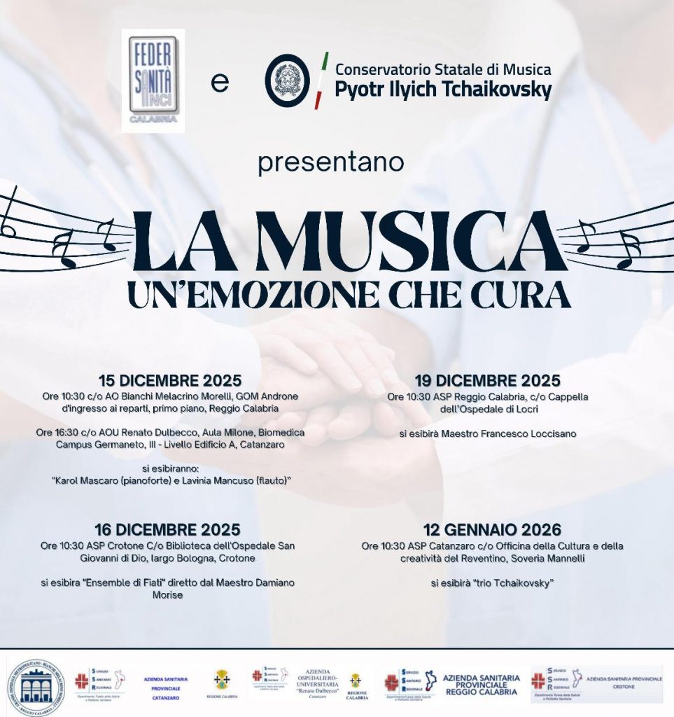 Per questo, è stata siglata una partnership fra Federsanità ANCI Calabria ed il Conservatorio Statale di Musica Pyotr Ilyich Tchaikovsky di Catanzaro che insieme, promuovono il progetto