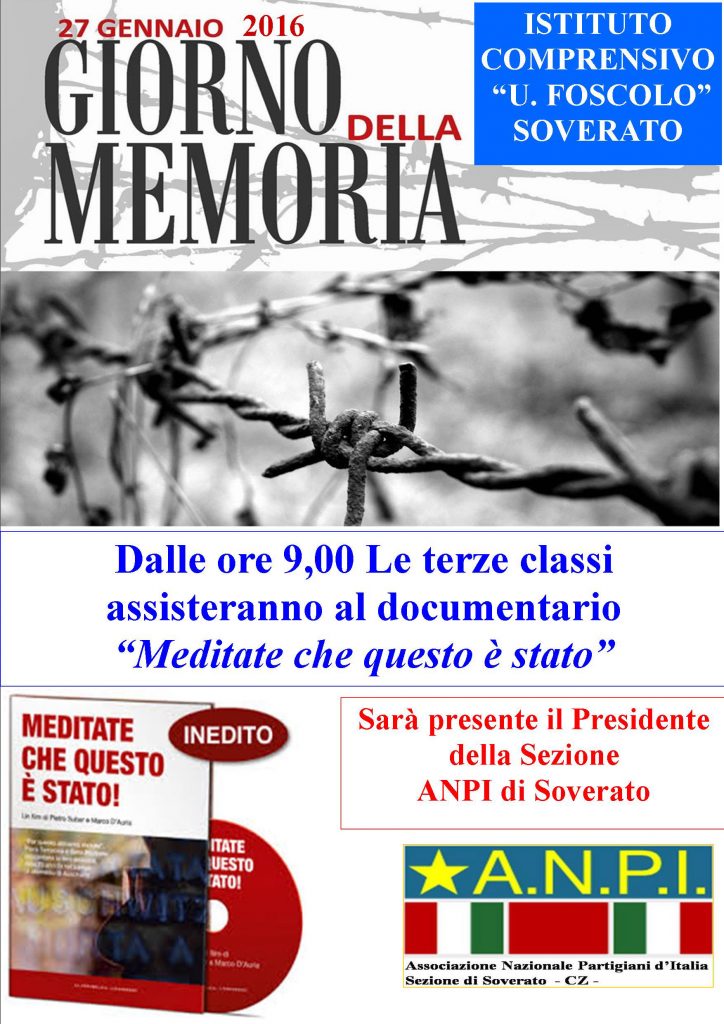 Mercoledì 27 gennaio dalle ore 9,00 le terze classi dell’Istituto U. Foscolo, assisteranno al documentario “Meditate che questo è stato” (messo a disposizione della Sezione ANPI di Soverato).