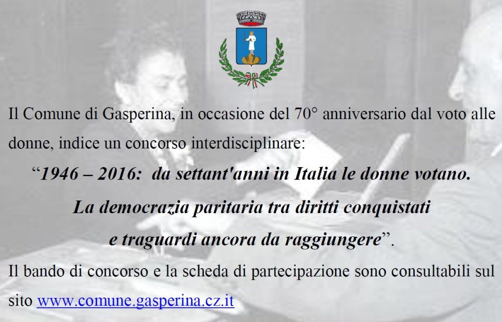Il comune di GASPERINA (CZ),bandisce un concorso interdisciplinare che quest’anno ha per tema il 70° anniversario dal voto alle donne “1946 – 2016: da settant’anni in Italia le donne votano. La democrazia paritaria tra diritti conquistati e traguardi ancora da raggiungere”. (Nel 2015 il concorso fu legato al 70° anniversario del 25 aprile).