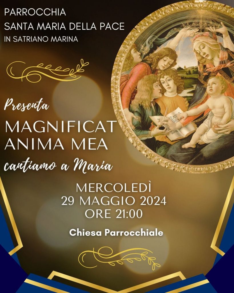 Dopo โPassione in coroโ dello scorso mese di marzo, la corale โ aumentata di qualche elemento โ ci riprova con MAGNIFICAT ANIMA MEA, sottotitolo Cantiamo a Maria. Momenti privilegiati di preghiera grazie alla musica, dedicati alla Vergine Maria a conclusione del mese mariano.