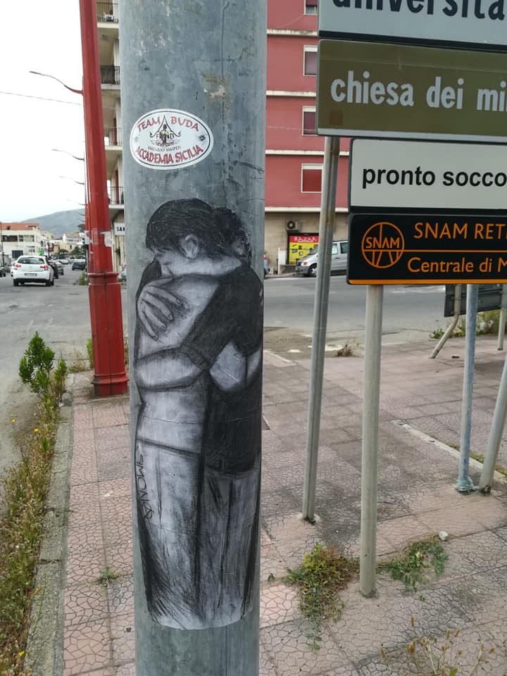 Nei giorni scorsi in città, sono apparsi dei nuovi pezzi di Street art per lo più raffiguranti abbracci, successivamente con la medesima tematica, la “stessa mano” e firma sono stati affissi anche a Messina, in Sicilia.