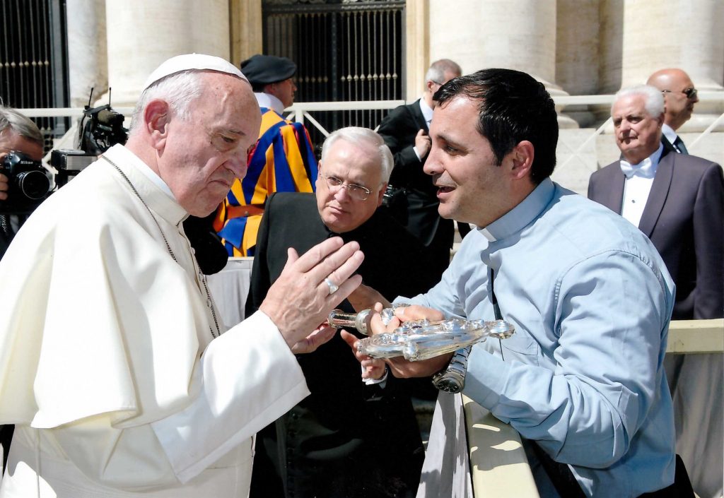 Una grande presenza di fedeli giunti anche dai paesi limitrofi, tanti emigrati, il sindaco Francesco Scarpelli, autorità civili e militari hanno voluto partecipare a questo momento di fede e di festa domenica 8 maggio in occasione della discesa dal monte di San Michele Arcangelo per proseguire in pellegrinaggio nella chiesa madre di San Nicola dell’Alto. Tra i tanti bei momenti vissuti della festa anche la partecipazione in Vaticano all’Udienza Generale di Papa Francesco di mercoledì 20 aprile 2016 che è stata una nuova occasione di grazia per la comunità parrocchiale di San Nicola dell’Alto. A quattro anni dalla benedizione, da parte di Papa Benedetto XVI, del Giglio d’oro e argento posto sull’elmo della sacra effige di San Michele Arcangelo, realizzato sempre dal maestro orafo Michele Affidato, la parrocchia sannicolese ha rivissuto infatti la stessa grande emozione con la benedizione impartita da Papa Francesco al nuovo Pastorale d’argento, che ha completato le insegne al suo Santo Protettore San Nicola Vescovo.