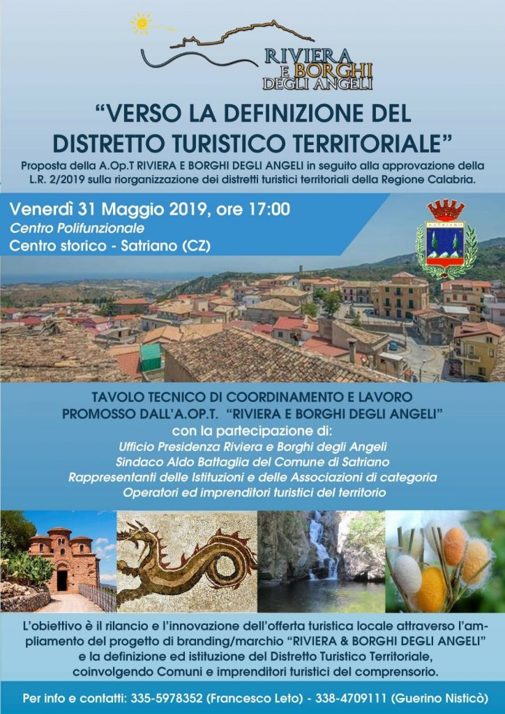 L’incontro, supportato istituzionalmente dal Comune di Satriano e dal Sindaco Aldo Battaglia, servirà a proseguire i lavori preliminari, di Manifestazione d’interesse per partecipare al tavolo tecnico e di coordinamento del nascente Distretto Turistico Territoriale.