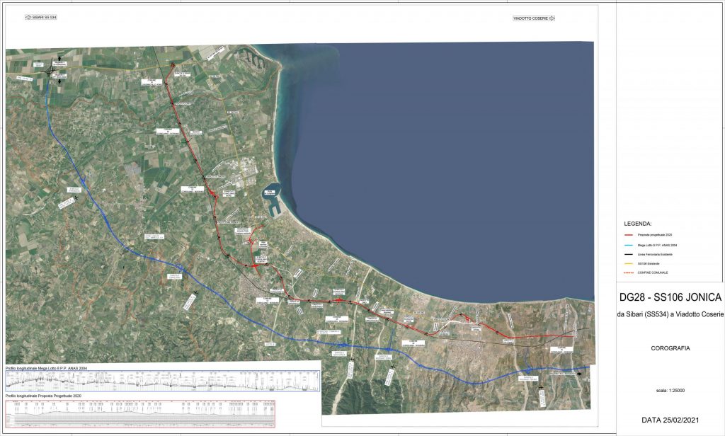 Il tracciato illustrato, rispetto all’originario del Megalotto 8 (nel suo stralcio fino al torrente Coserie), è più spostato verso la costa, e consente l’eliminazione delle 23 gallerie (per complessivi 11 km) presenti sul precedente tracciato oltre ad una sensibile riduzione dei viadotti, limitati allo scavalcamento delle fiumare ed al superamento delle zone a rischio idraulico nonché gli abitati di Corigliano Scalo e Rossano Scalo.