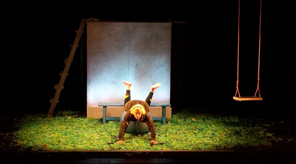 Sul palco un’altalena, un pallone, una panca e un parallelepipedo alto almeno due metri la cui sommità è raggiunta dall’attrice mediante una ripida scala. Per evidenziare la profonda concentrazione di cui è capace. Anche quando rischia di cadere (non per finzione), la sua attenzione non ne risente minimamente.
