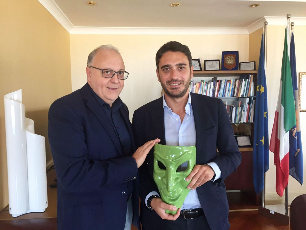 A consegna la “maschera verde”, realizzata a mano dal maestro Alessandro Cavaliere e simbolo dell’edizione 2018/2019 della stagione teatrale che sta per iniziare, il direttore artistico della rassegna “Vacantiandu” Nicola Morelli, in un incontro che si è svolto a Palazzo Campanella a Reggio Calabria. Per l’occasione, sono state illustrate al presidente Irto le attività che saranno portate avanti in questo nuovo anno, che prevede come sempre momenti di teatro, cabaret ma anche tanta solidarietà.