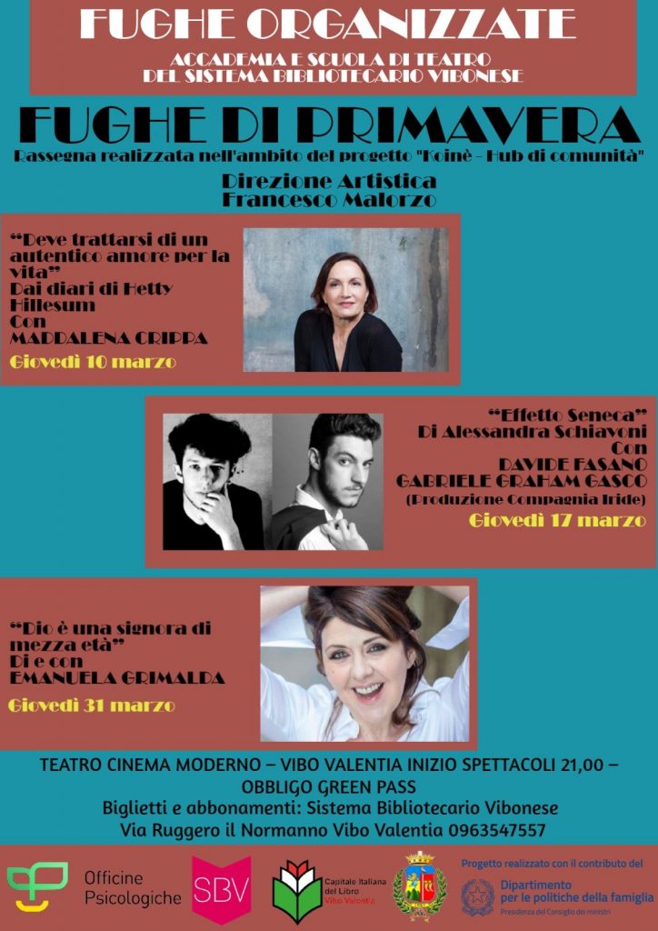 La rassegna teatrale “Fughe di primavera” è realizzata nell’ambito del progetto “KOINE – HUB di Comunità” promosso dal SBV e finanziato dal Dipartimento per le politiche della famiglia, e rientra inoltre tra le attività di “Vibo Valentia – Capitale del Libro 2021”.