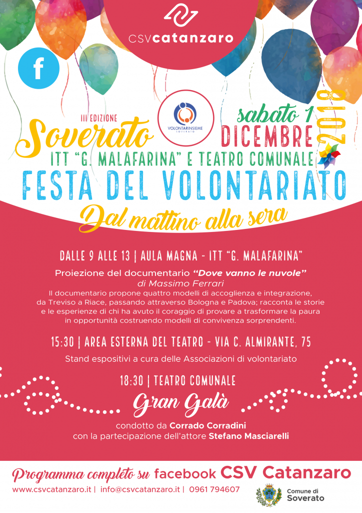 Dicembre è il mese scelto dalle associazioni di volontariato del comprensorio di Soverato per “fare festa”: per la terza edizione si riconfermano infatti la data dell’1 dicembre e il luogo (il Teatro Comunale, al quale si aggiunge il matinèe all’Istituto Tecnico “Malafarina”) sotto il comune segno distintivo di “Volontarinsieme”.